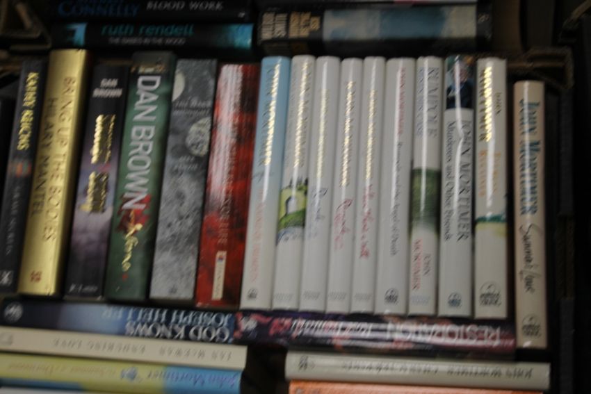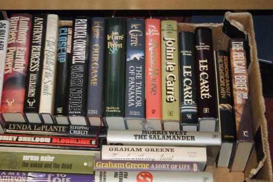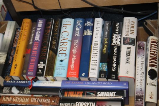 FOUR TRAYS OF HARDBACK NOVELS INCLUDING SOME FIRST EDITIONS