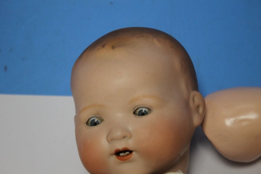 AN ARMAND MARSEILLE ANTIQUE BISQUE HEADED DOLL, MARKED A.M. GERMANY 351/6K¦Condition Report:THE DOLL IS DISJOINTED BUT COMPLETE, THERE ARE NO CHIPS OR CRACKS TO THE HEAD¦
