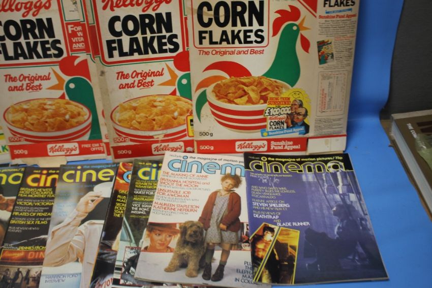 "CINEMA" MAGAZINES, EARLY 1980S NUMBERS 1-9 AND A WINTER SPECIAL FEATURING, The History of British Sex Films, Rocky 3, Pink Floyds "The Wall", Tron, Thae Steven Spielberg story etc published by Marvel Comics together with FIVE EMPTY KELLOGG'S CORN FLAKE PACKETS 1980S, to include Special Diamond Jubilee Pack, Morecambe & Wise Sunshine Fund Appeal (missing piece on the back), two Free EMI Super C60 tape, year 2000 competition for 100 Sinclair Spectrums c.1984