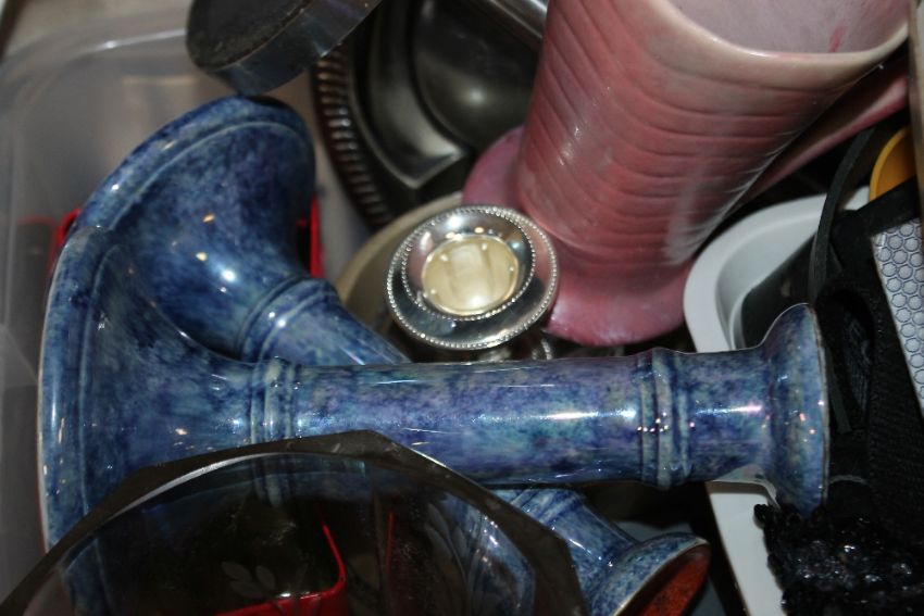 A BOX OF SUNDRIES TO INCLUDE CERAMIC CANDLESTICK HOLDERS, WHITE METAL TRAY ETC.