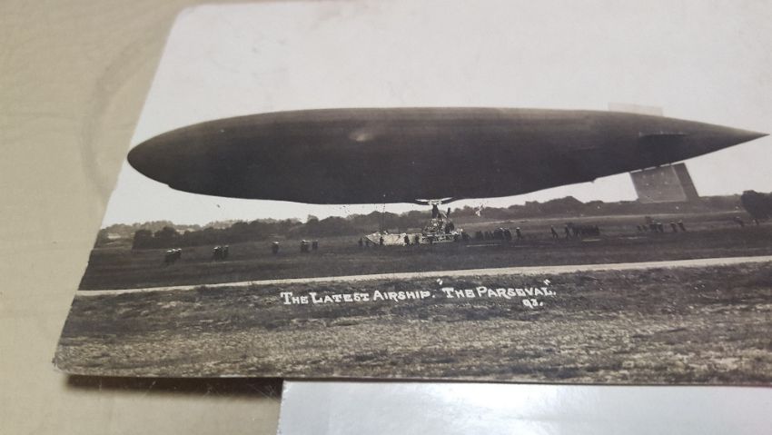 A GLASS PAPERWEIGHT OR PICTURE FRAME INCLUDING A POSTCARD OF THE FIRST WORLD WAR AIRSHIP "THE PARSEVAL" AND ANOTHER OF A VERY EARLY AEROPLANE, POSTCARDS EASILY REMOVED