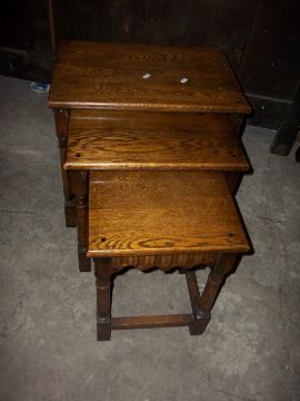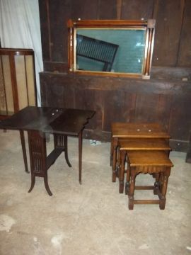 THREE ITEMS, AN OAK NEST OF THREE TABLES , A GATELEG DROP LEAF TABLE AND AN OVER MANTLE WALL MIRROR