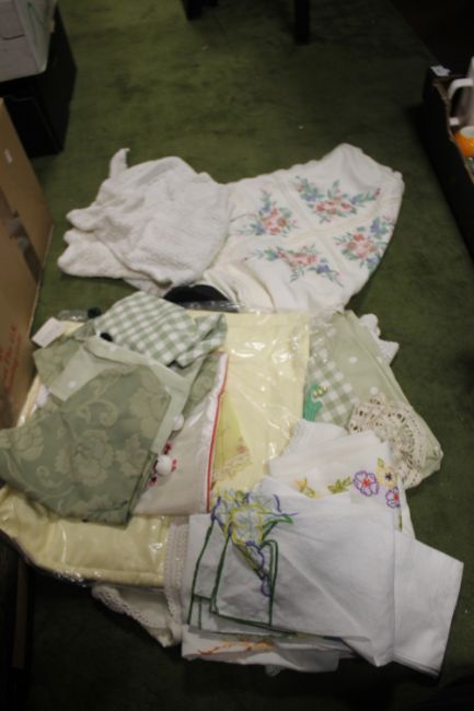 A TRAY OF LINEN INCLUDING EMBROIDERY