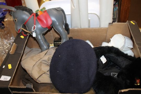 A BOX OF MILITARY ITEMS TO INCLUDE A RUSSIAN STYLE HAT AND A LEATHER DONKEY