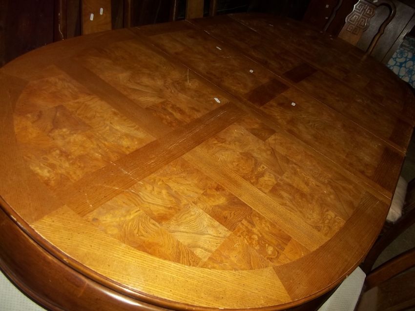 A LARGE OVAL EXTENDING DINING TABLE AND SIX CHAIRS INCLUDING TWO CARVERS