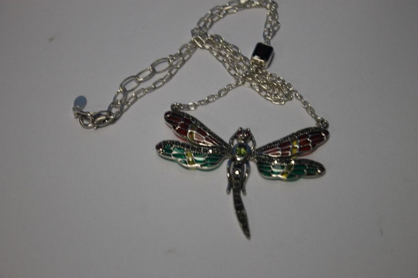A SILVER PLIQUE-A-JOUR DAMSEL FLY NECKLACE SET WITH PERIDOT GARNETS, RUBIES AND MARCASITES