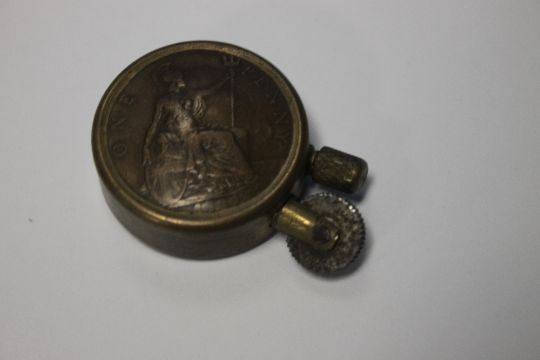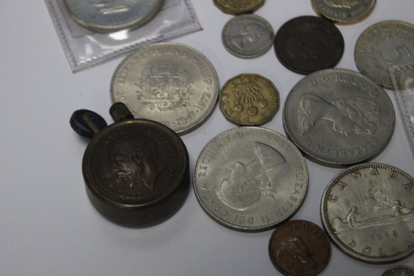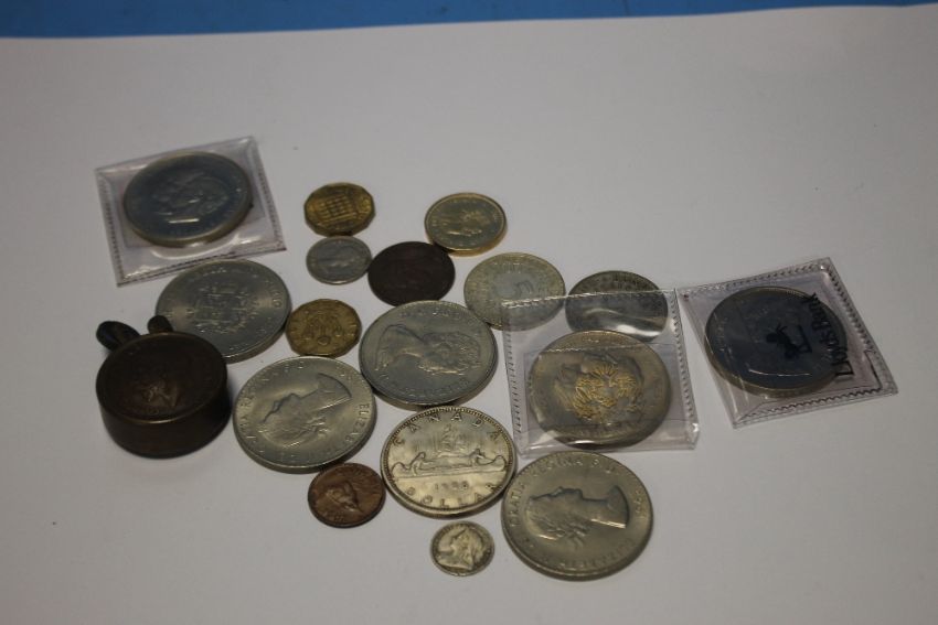 A WWI TRENCH ART CIGARETTE LIGHTER, A CANADA 1966 SILVER DOLLAR AND OTHER COINS ETC.