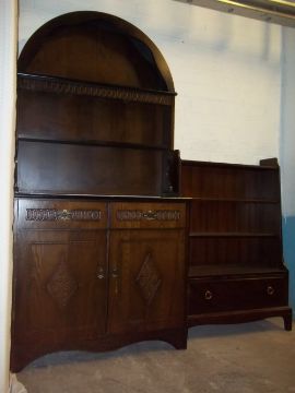 AN OAK DOME TOPPED DISPLAY UNIT / WELSH DRESSER AND A STAG SINGLE DRAWER BOOKSHELF