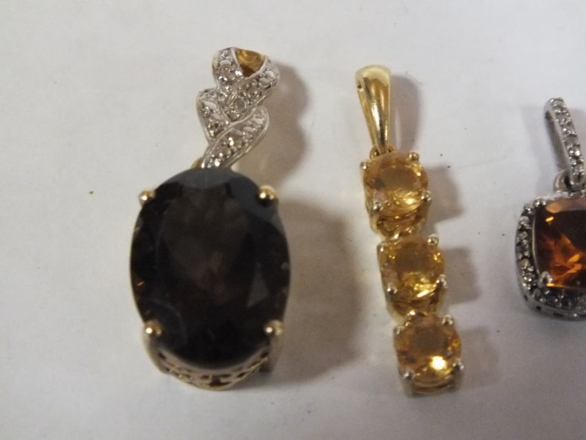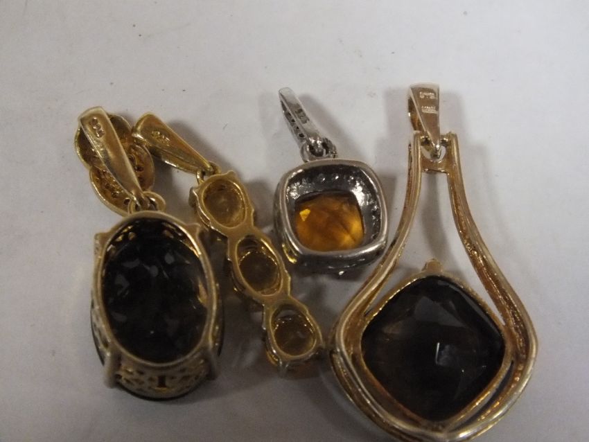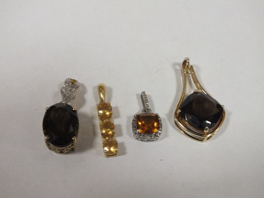 FOUR SILVER AND SILVER GILT VINTAGE PENDANTS, TO INCLUDE CITRINE, TWO LARGE SMOKEY QUARTZ ETC. (4)