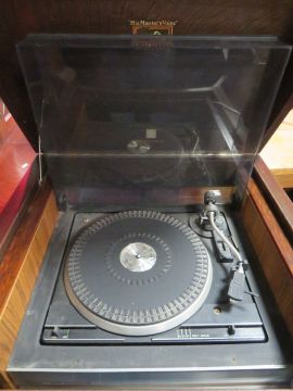 A VINTAGE OAK GRAMOPHONE CABINET WITH A FERGUSON 15 HI-FI SYSTEM, RECORD DECK AND SPEAKERS