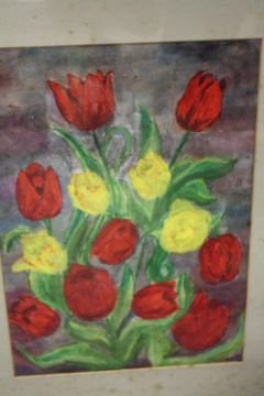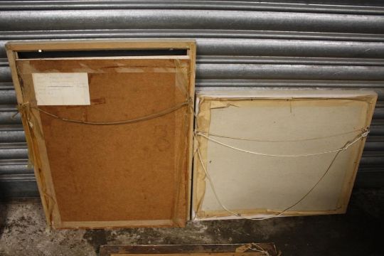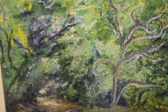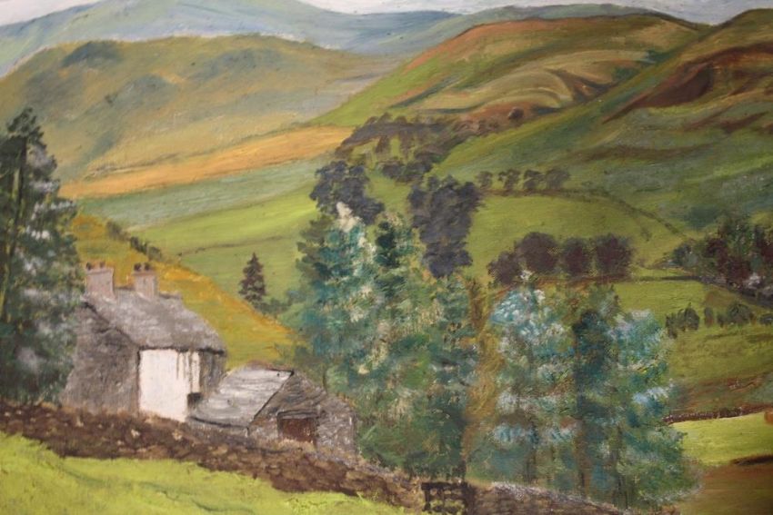 A FRAMED OIL ON CANVAS ENTITLED 'A CUMBERLAND FARM', TOGETHER WITH A STILL LIFE WATERCOLOUR OF TULIPS, AND AN IMPRESSIONIST WOODED PATH PICTURE (3) LARGEST INCLUDING FRAME - 59.5CM X 46.5CM
