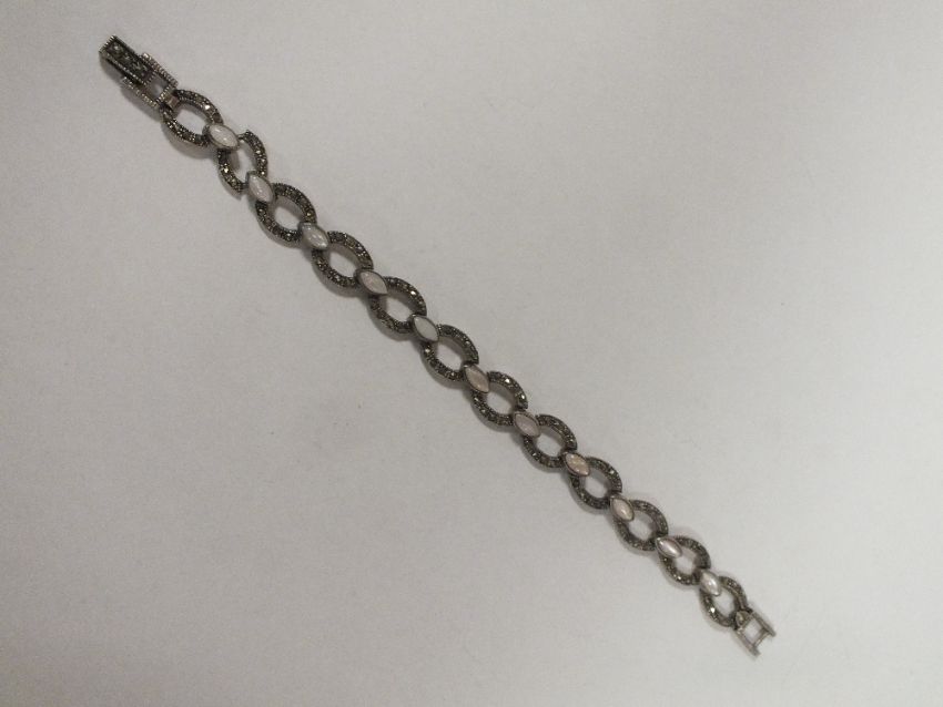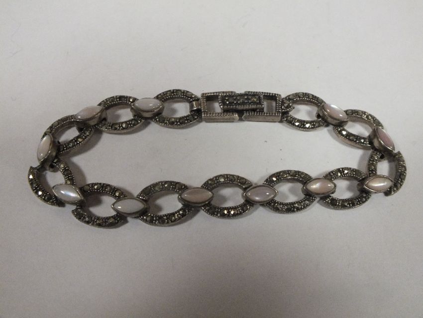 A LADIES VINTAGE 925 SILVER MARCASITE AND MOTHER OF PEARL BRACELET