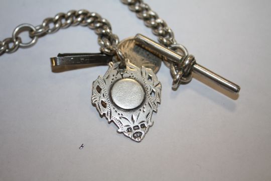 AN ANTIQUE HALLMARKED SILVER GRADUATED ALBERT POCKET WATCH CHAIN WITH SILVER FOBS TOTAL WEIGHT 65.4 G
