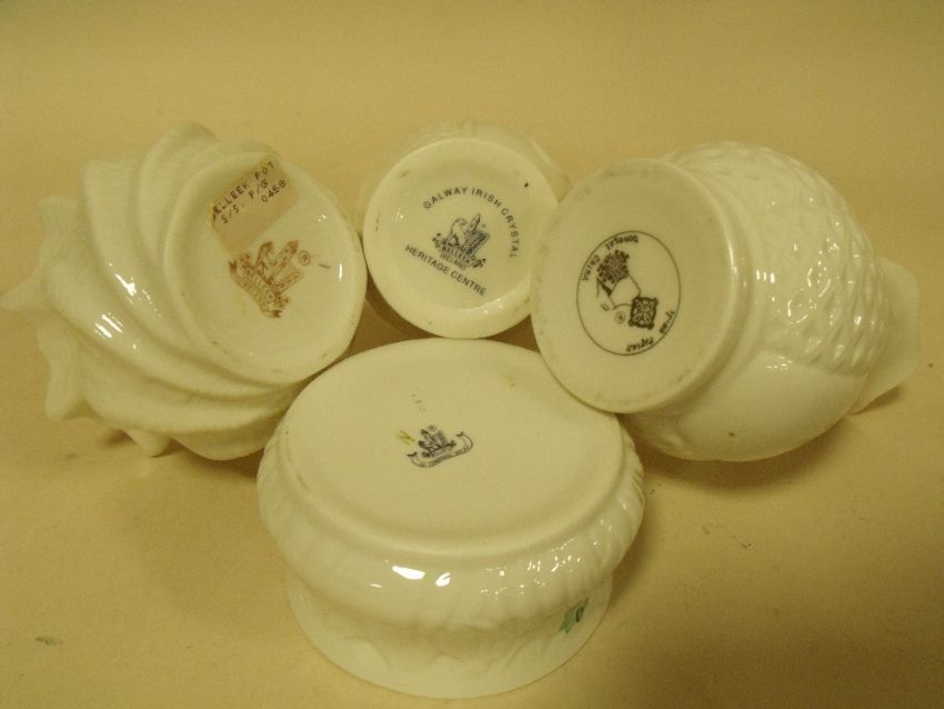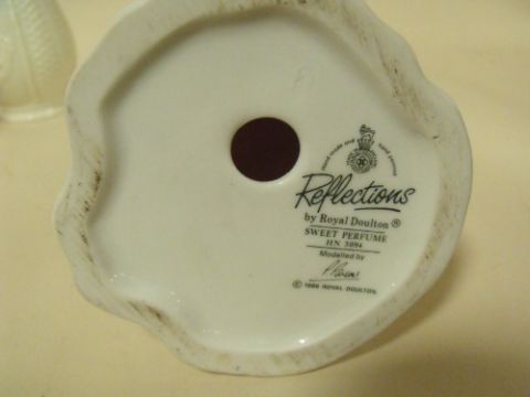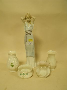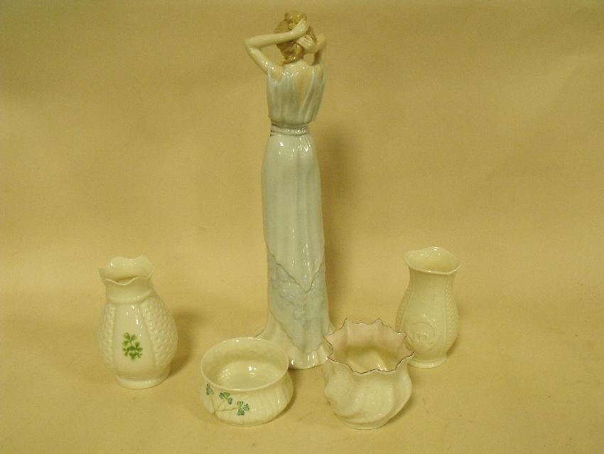 A ROYAL DOULTON REFLECTIONS FIGURE, SWEET PERFUME HN3094 TOGETHER WITH FOUR SMALL BELLEEK VASES
