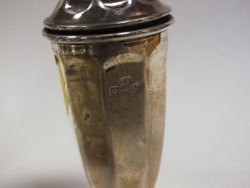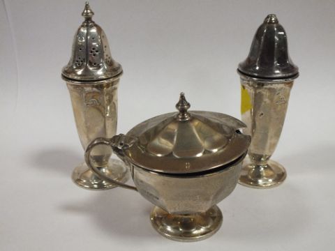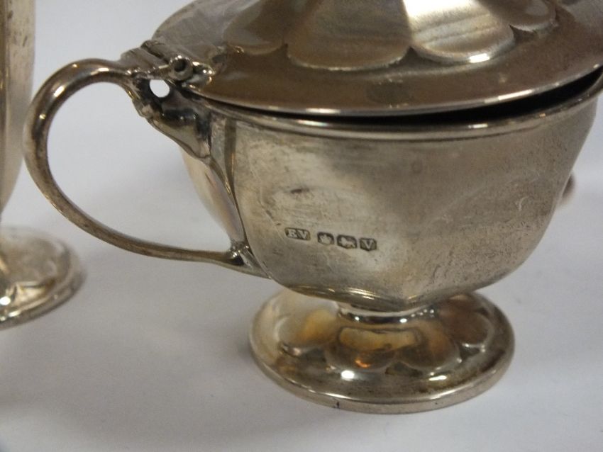 A HALLMARKED SILVER MUSTARD POT WITH BLUE GLASS LINER TOGETHER WITH A PAIR OF HALLMARKED SILVER SALT AND PEPPER SHAKERS