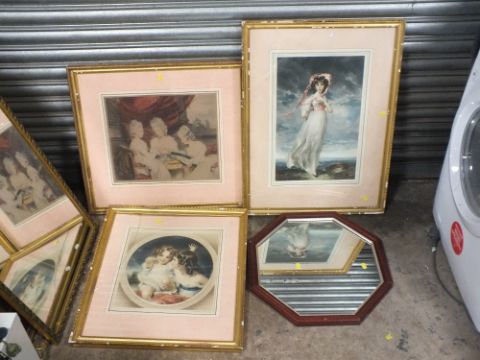 THREE FRAMED ANTIQUE STYLE PRINTS, TOGETHER WITH A MODERN MIRROR (4)