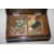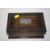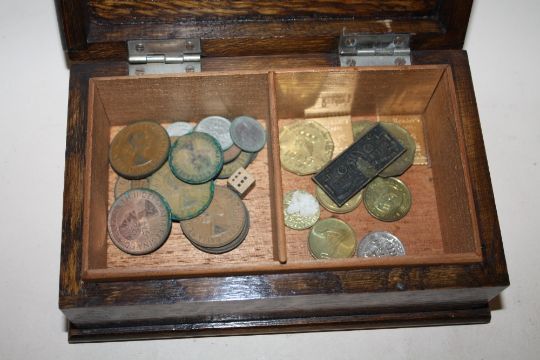 AN ANTIQUE CIGARETTE BOX WITH HALLMARKED SILVER PANEL TO LID, WITH COINS WITHIN