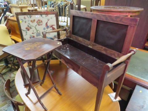 A VINTAGE OAK FRAMED FIRESCREEN INLAID FOLDING TABLE, A SMALL MAGAZINE RACK AND DUET PIANO STOOL (4)