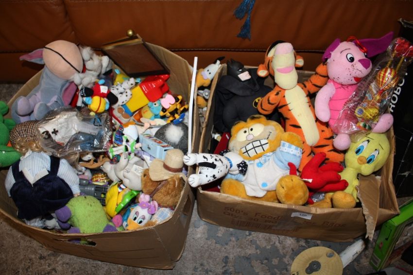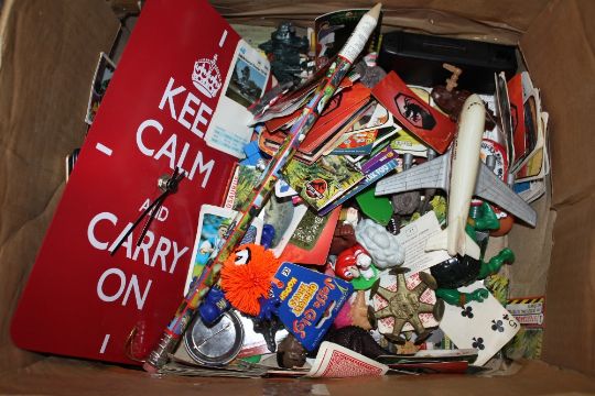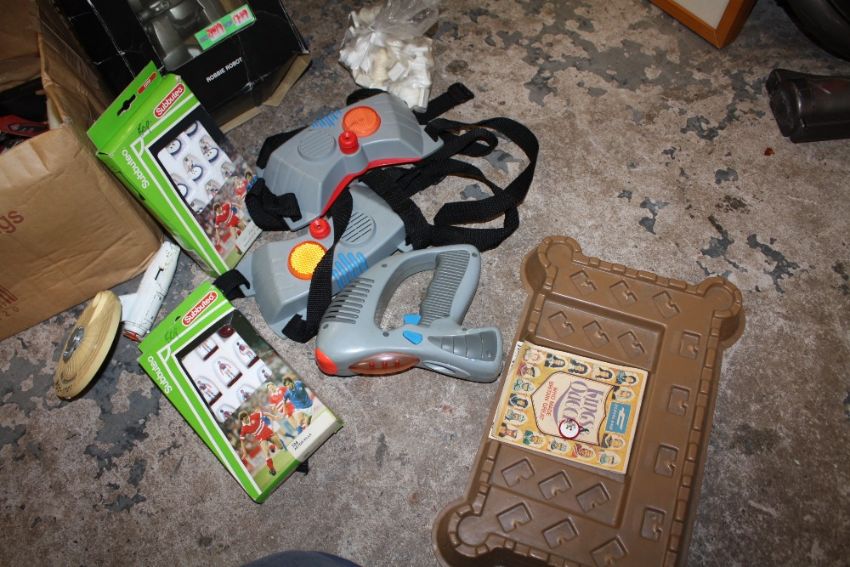 TWO BOXES OF ASSORTED TOYS TO INCLUDE A DINKY DIECAST USS ENTERPRISE, SUBUTTEO PLAYERS ETC.
