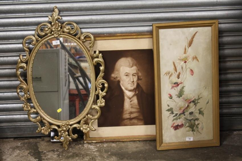 A VICTORIAN FLORAL PAINTING ON MILK GLASS, TOGETHER WITH A PORTRAIT PRINT OF A GENTLEMAN, AND A GILT FRAMED MIRROR (3)