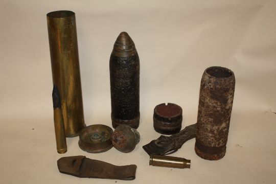 A BOX OF VINTAGE SHELL CASES, TRENCH ART VASE ETC.