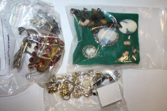 A QUANTITY OF ASSORTED COSTUME JEWELLERY TO INCLUDE RINGS, CAMEOS, BROOCHES ETC.