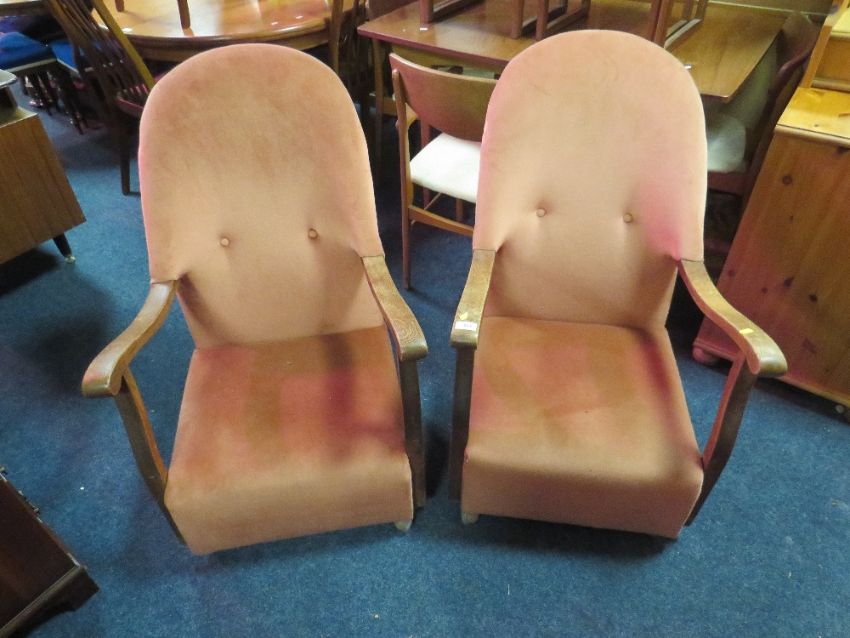 A PAIR OF VINTAGE OAK FRAMED UPHOLSTERED ARMCHAIRS