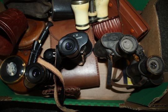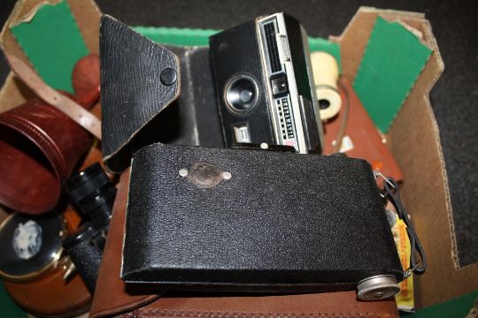 A TRAY OF COLLECTABLES TO INCLUDE VINTAGE CAMERAS AND BINOCULARS