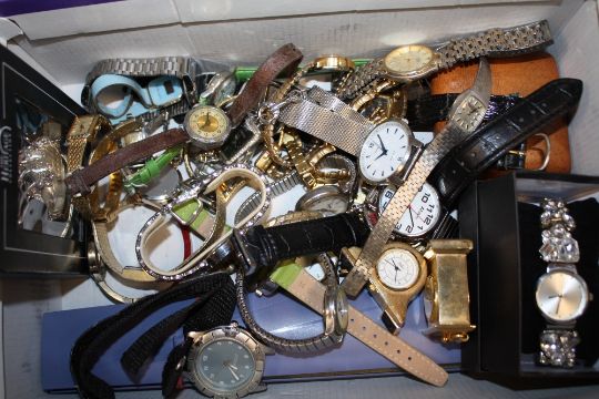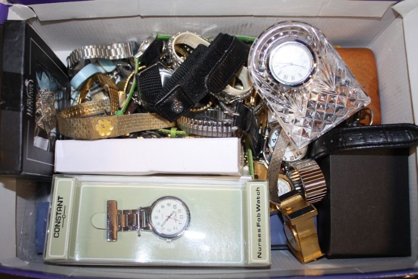 A BOX OF ASSORTED WRISTWATCHES TO INCLUDE A WATERFORD CRYSTAL DESK CLOCK