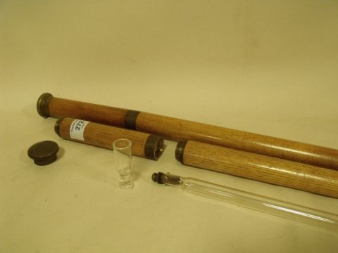 A PAIR OF UNUSUAL LIGHT OAK AND BRASS WALKING CANES WITH INTERIOR SPIRIT FLASKS AND MINIATURE DRINKING GLASSES, LENGTH 92 AND 85 CM