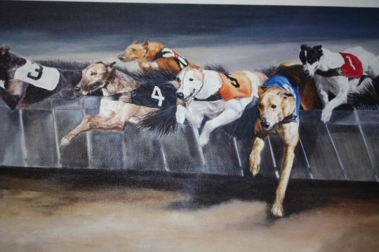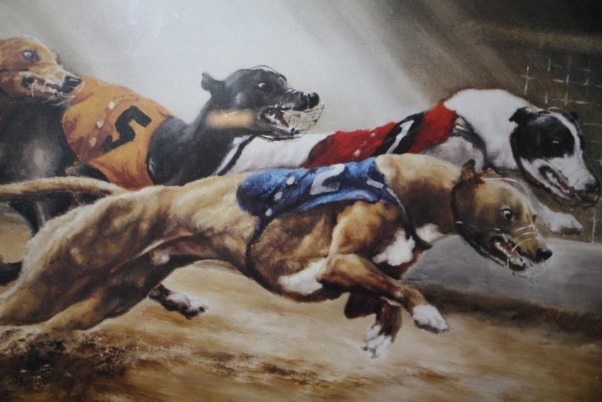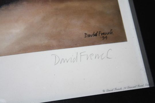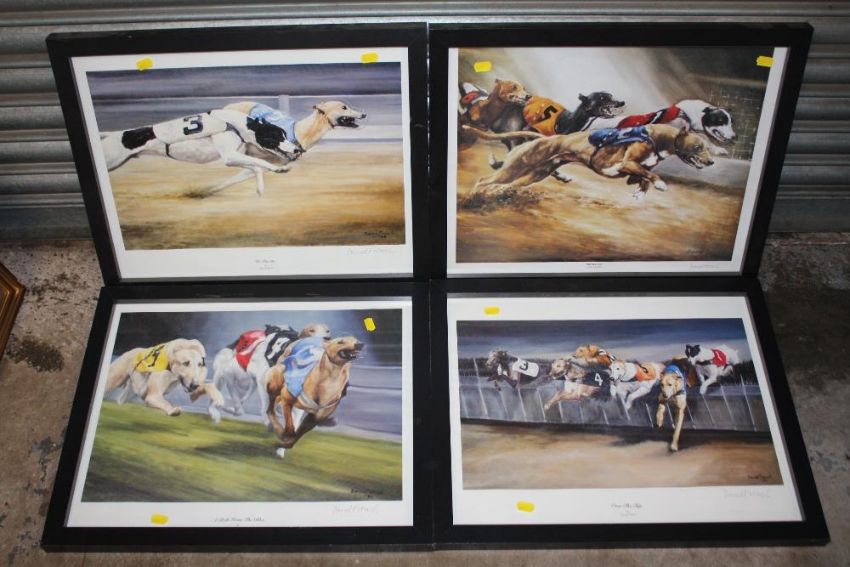 A SET OF FOUR FRAMED AND GLAZED SIGNED DOG RACING INTEREST PRINTS BY DAVID FRENCH OVERALL SIZE INCLUDING FRAMES - 55CM X 45CM