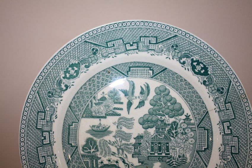 TWO TRAYS OF CHINA AND CERAMICS TO INCLUDE ROYAL WORCESTER CUPS AND SAUCERS, WILLOW PATTERN DINNER WARE ETC.