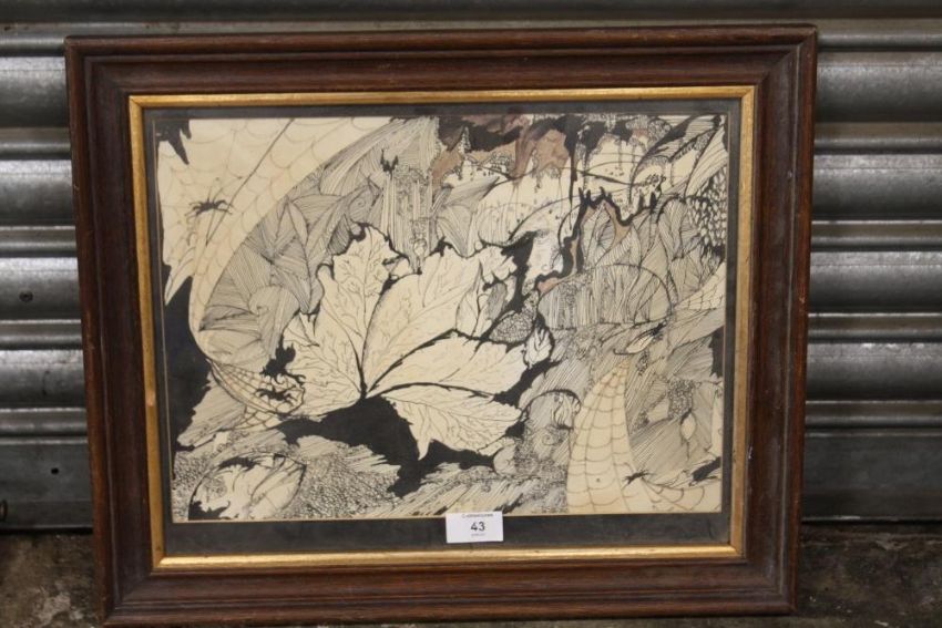 A FRAMED AND GLAZED PEN AND INK DRAWING OF SPIDERS IN A FANTASY LANDSCAPE