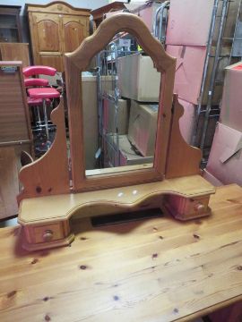 A PINE TWIN PEDESTAL DRESSING TABLE / DESK WITH A SEPARATE MIRROR AND A STOOL W 135 CM