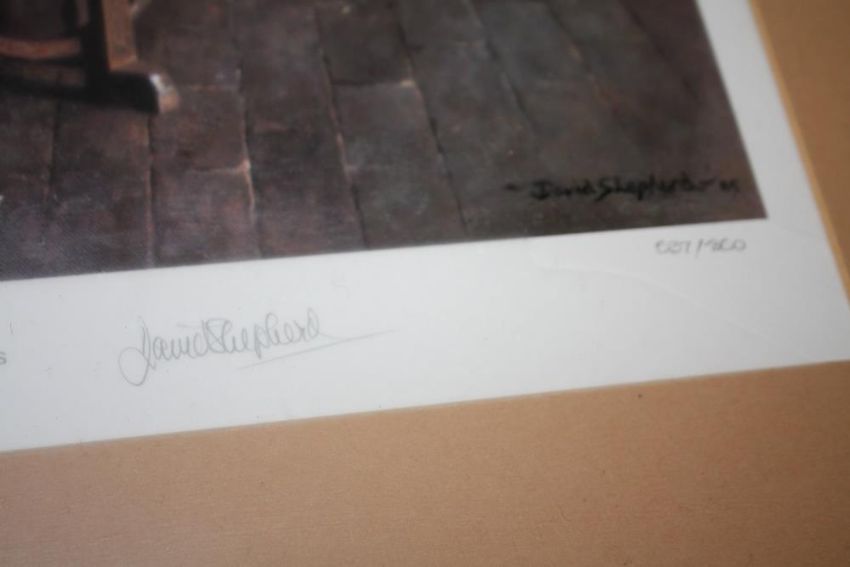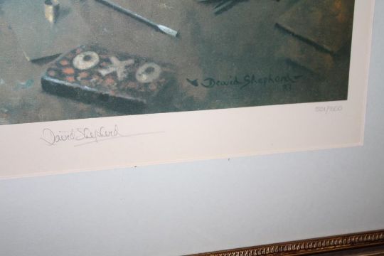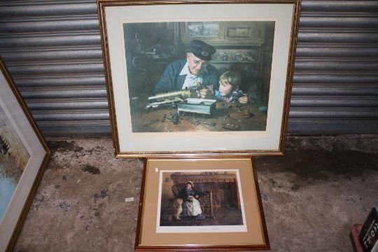 TWO FRAMED AND GLAZED SIGNED DAVID SHEPHERD PRINTS ENTITLED GRANDPAS WORKSHOP 331/350, AND COTTAGE COMPANIONS 537/860 LARGEST SIZE INCLUDING FRAME - 86CM X 78CM