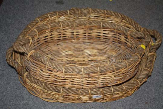 TWO WICKER ROPE HANDLED OVAL LOG BASKETS, LARGEST WIDTH, 66 CM