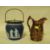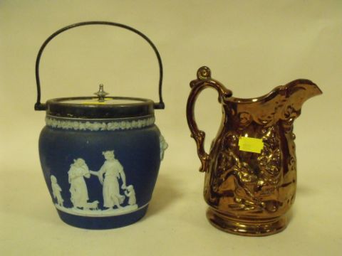 A WEDGWOOD LIDDED JASPERWARE CRACKER BARREL TOGETHER WITH A JUG