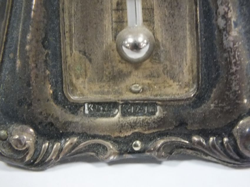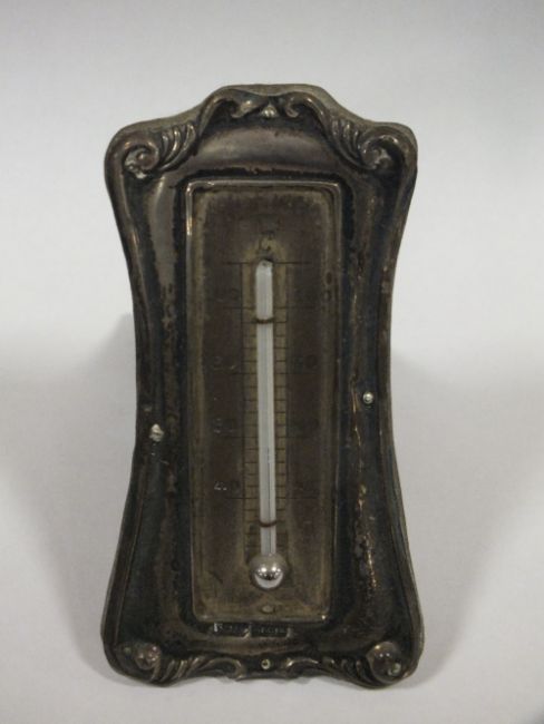 A SMALL HALLMARKED SILVER DESK THERMOMETER, HEIGHT 10 CM