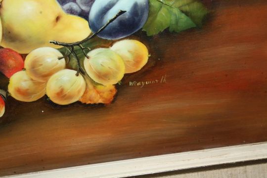 A FRAMED OIL ON BOARD STILL LIFE STUDY OF FRUIT, SIGNED RAYWORTH, 61 X 52 CM