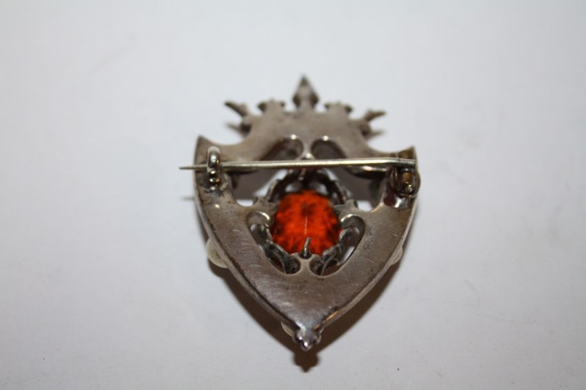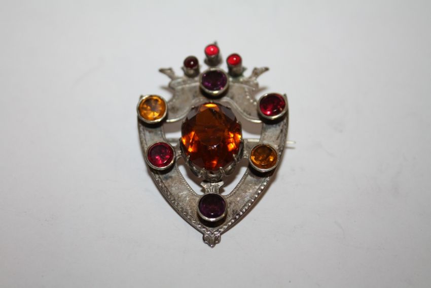 A SCOTTISH STYLE WHITE METAL MULTI GEM SHIELD SHAPED BROOCH