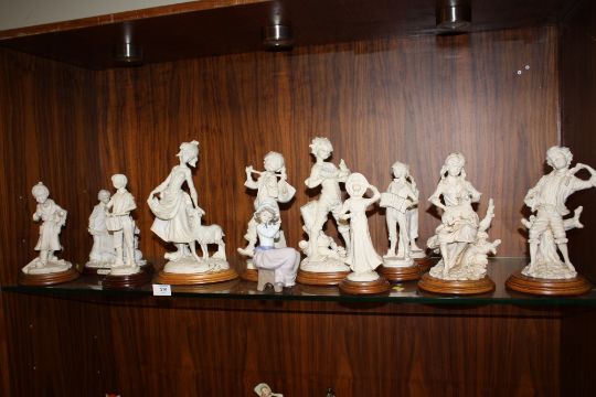 A NAO FIGURE OF A YOUNG GIRL HOLDING A PUPPY TOGETHER WITH A COLLECTION OF MODERN RESIN FIGURES ON WOODEN PLINTHS (12)