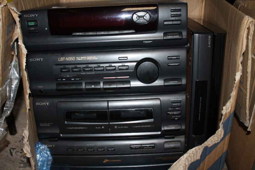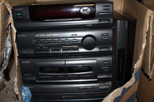 A SONY STEREO LBT-N350 PLUS A BOX OF WIRE ETC