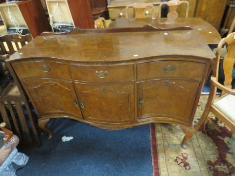 A RETRO WALNUT DRAWLEAF DINING TABLE, SIX CHAIRS AND A SIDEBOARD