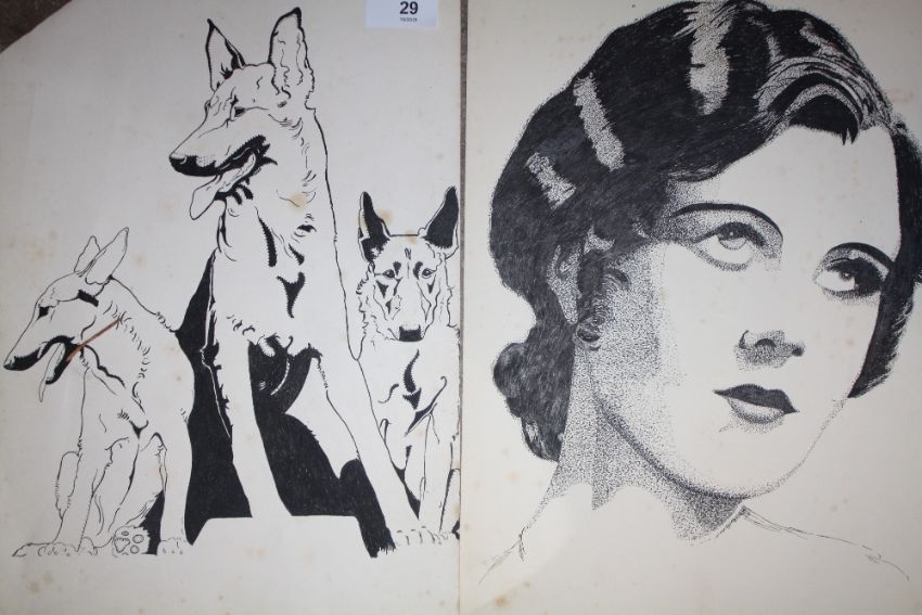A COLLECTION OF ASSORTED UNFRAMED PICTURES TO INCLUDE AN OIL ON CANVAS PORTRAIT STUDY, WATERCOLOUR PORTRAIT, PEN AND INK DRAWINGS ETC