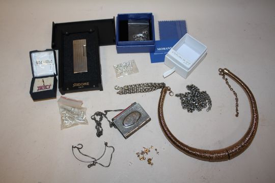 A BOX OF JEWELLERY AND COLLECTABLES TO INCLUDE SILVER EXAMPLES, BOXED SAROME LIGHTER, MINIATURE COPY OF THE QURAN IN HOLDER