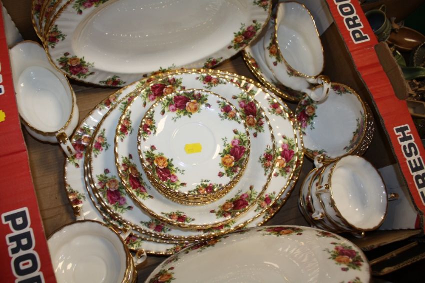 THREE TRAYS OF ROYAL ALBERT OLD COUNTRY ROSES CHINA TO INCLUDE TUREENS, TEAWARE, PLATES ETC