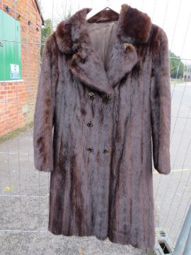 A VINTAGE RICH MAHOGANY BROWN MINK FUR COAT, fully lined, hook fasteners, front pockets, approx size 38"