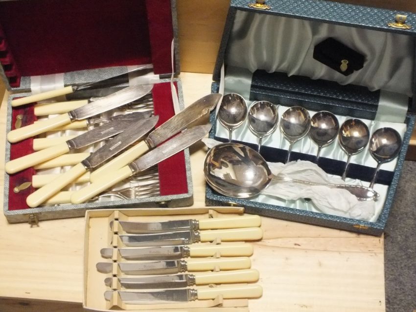 A COLLECTION OF CUTLERY SETS TO INCLUDE AN OAK CASED CANTEEN