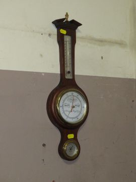 A MAHOGANY TAPESTRY FIRE SCREEN AND A SMALL BAROMETER (2)