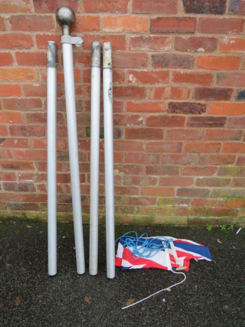 A 16FT ALUMINIUM FLAG POLE WITH A STITCHED, COTTON UNION JACK FLAG